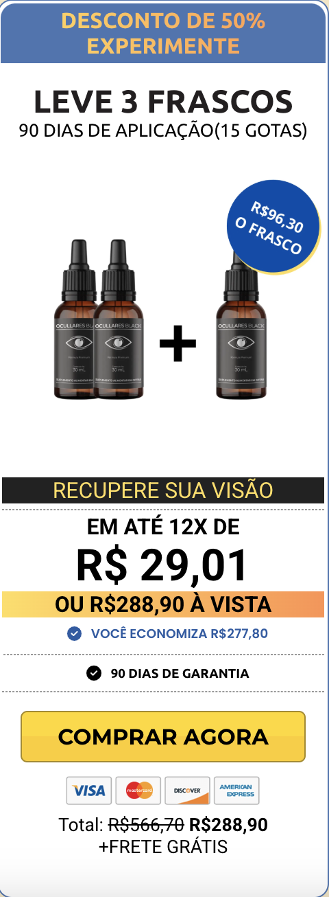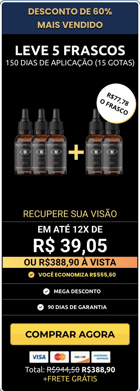 Com um complexo exclusivo de antioxidantes, vitaminas, minerais e extratos naturais, o Ocullares Black atua diretamente nos olhos, protegendo a retina, combatendo o envelhecimento ocular, fortalecendo a visão e prevenindo problemas como catarata, olho seco e degeneração macular.